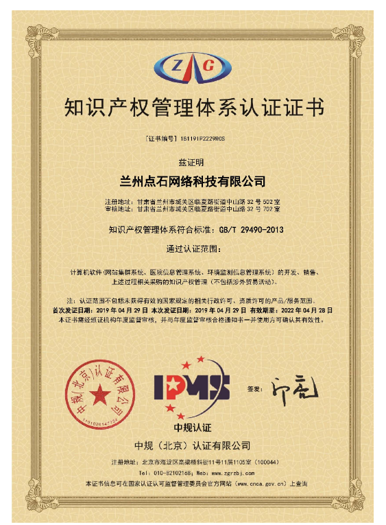 經(jīng)過(guò)點(diǎn)石家人近一年的不懈努力,終于拿到知識(shí)產(chǎn)權(quán)管理體系認(rèn)證證書(認(rèn)證范圍:網(wǎng)站群管理系統(tǒng)、醫(yī)院管理系統(tǒng)、環(huán)境監(jiān)測(cè)系統(tǒng)的開(kāi)發(fā)和銷售)。本認(rèn)證體系的通過(guò)標(biāo)志著蘭州點(diǎn)石公司的軟件開(kāi)發(fā)能力和規(guī)范化管理能力又向前邁進(jìn)了一大步!(AD:全省目前通過(guò)本體系認(rèn)證的信息化企業(yè)不足5家)